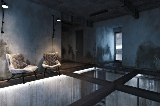 Piso traslúcido enmarcados en vigas de acero, las paredes en cemento pulido que tiene la característica de parecer que tiene filtraciones de agua, todo es parte del diseño industrial que le ha aplicado el arquitecto Igor SirotovDiseño de la sala estilo industrial, a pesar de los elementos estructurales como el techo de vigas de fierro sin enlucir, el arquitecto ha logrado un acogedor diseño, se unen elementos rústicos como una gran mesa de madera y una moderna chimenea, hay contraste pero manteniendo el estilo