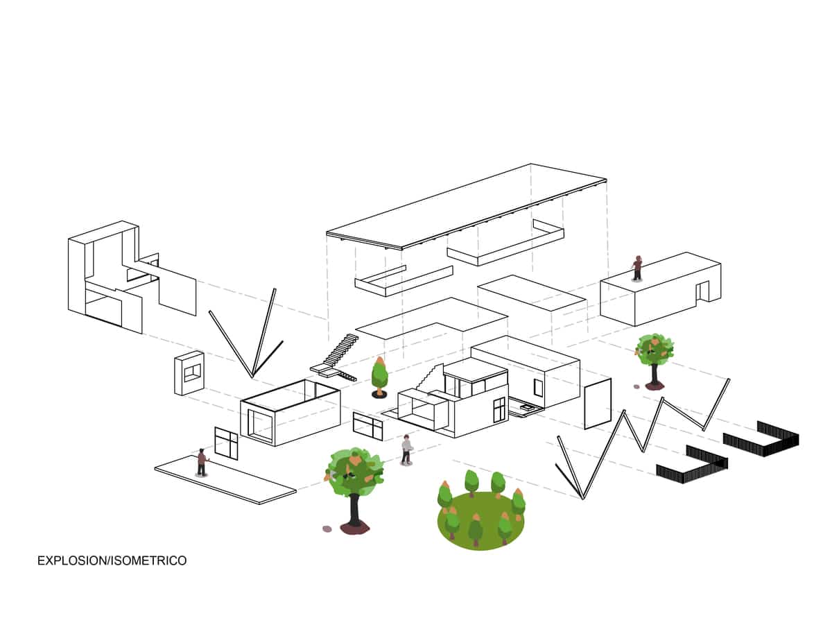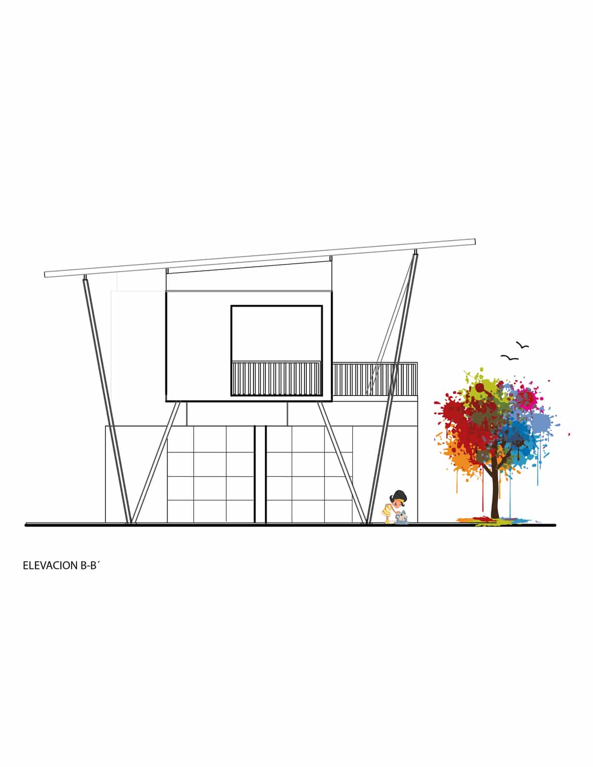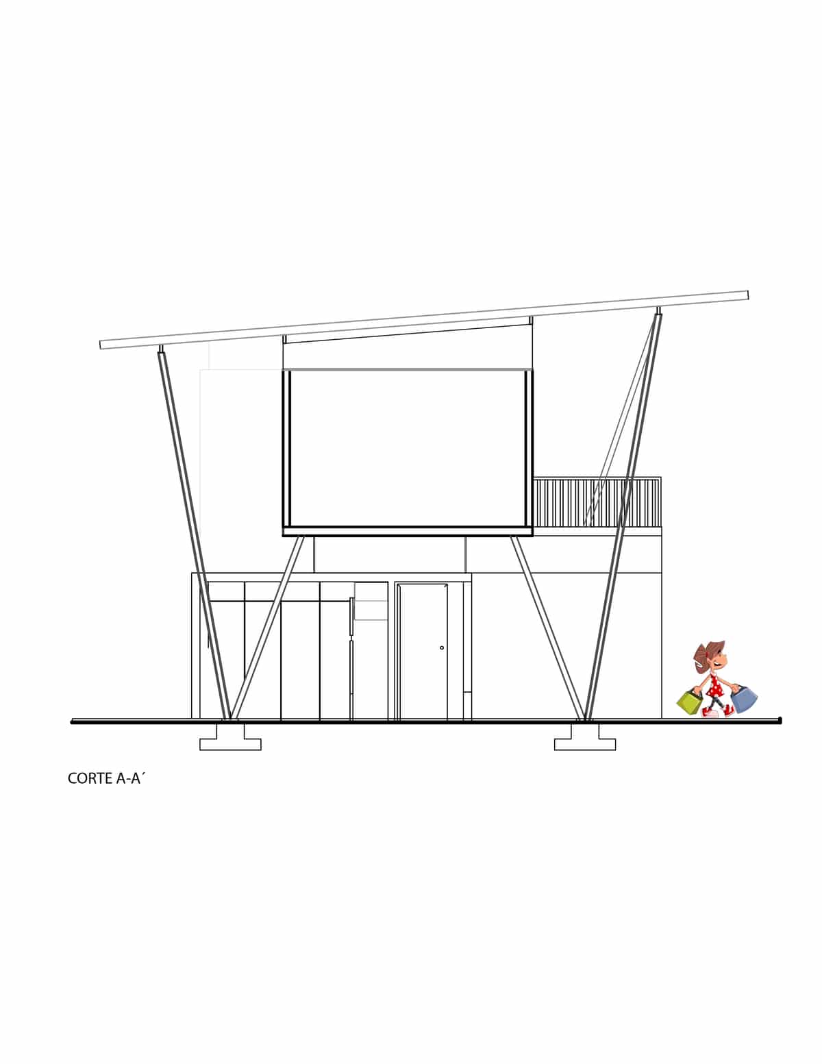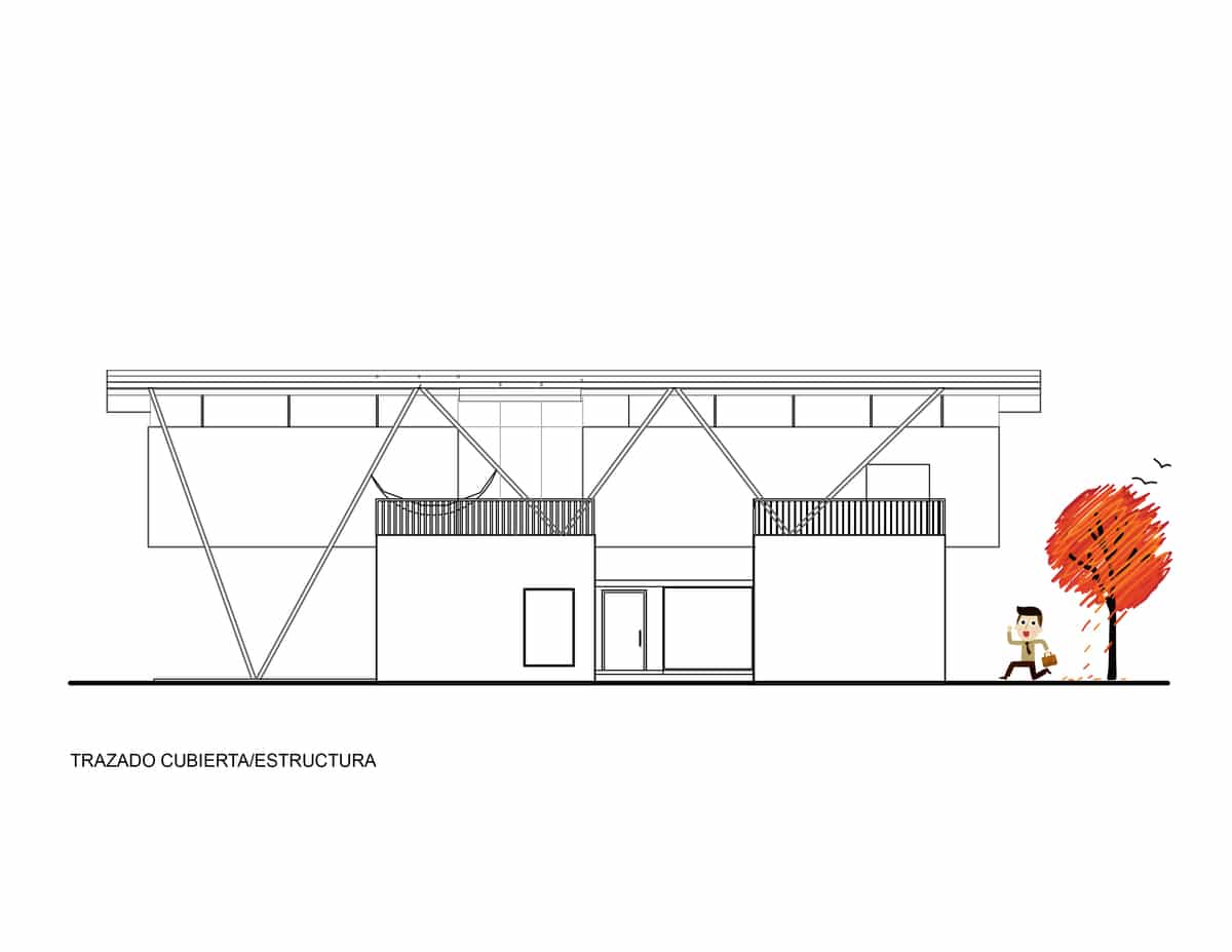 Planos de casa de dos pisos y tres dormitorios construida en 240 m², moderna cobertura con estructuras portantes expuestas