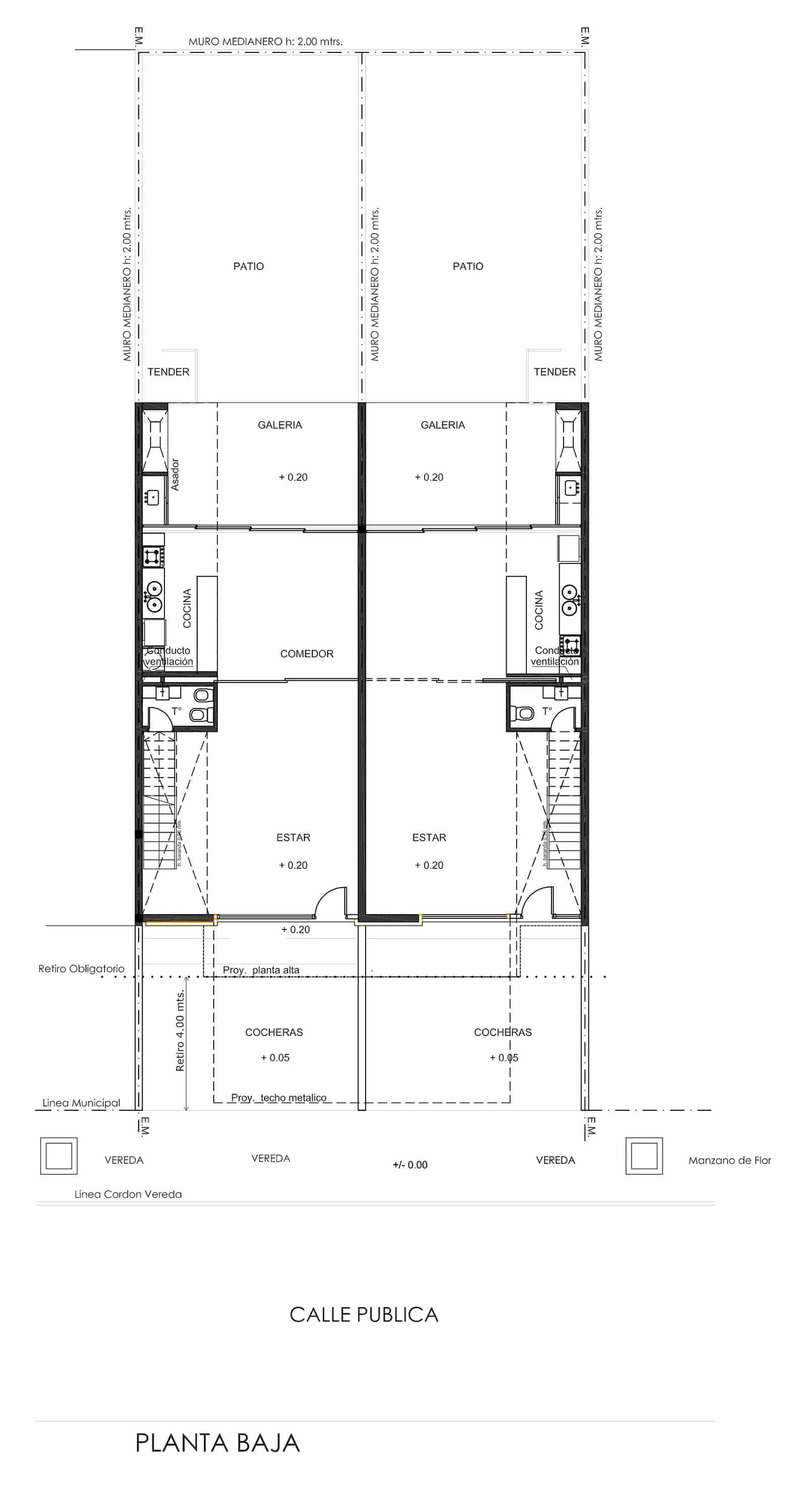 Como podemos ver el lote ha sido divido en dos partes iguales, de esta forma cada vivienda tiene un área de 6.2 x 14.5 metros haciendo un total de 89.9 m² construidos por cada casa.