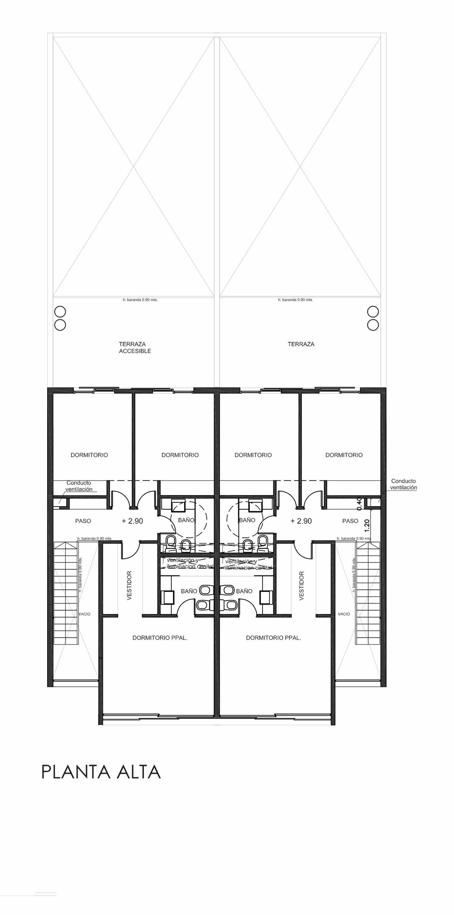 En el segundo piso se ubican las habitaciones, cada casa tiene tres dormitorios, el dormitorio principal (12) tiene las visuales hacia el frente principal y cuenta con closets dobles y cuarto de baño, las habitaciones secundarias comparten el cuarto de baño (11) que se ubica al frente del pasadizo (9).